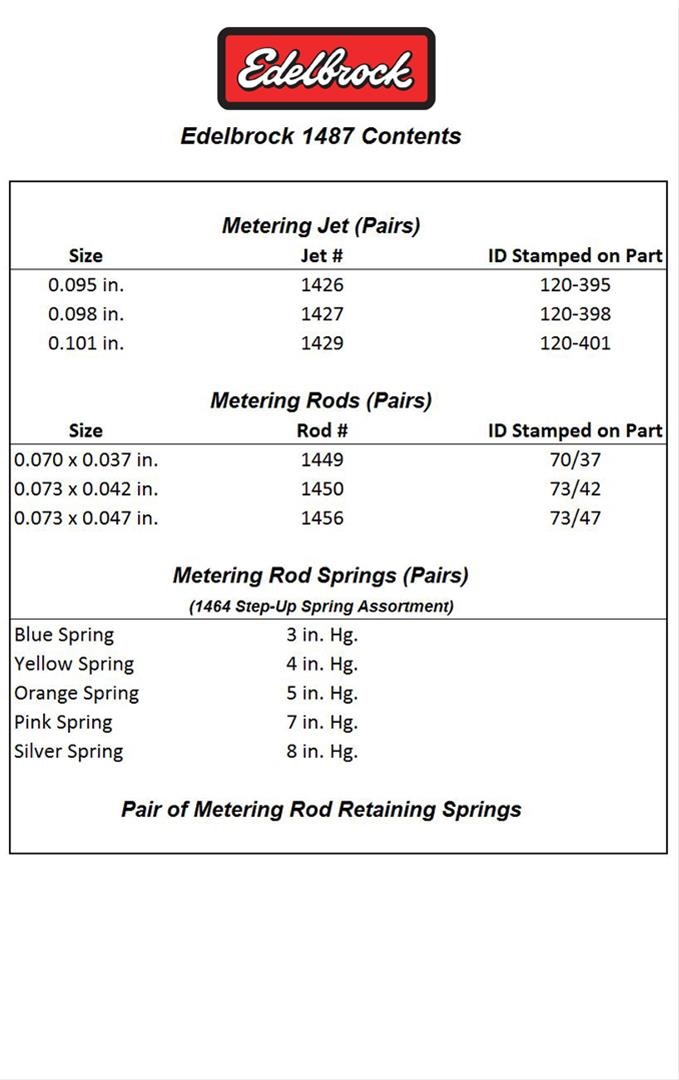 - Metering Rods: .070 x .037, .073 x .042, .073 x .047