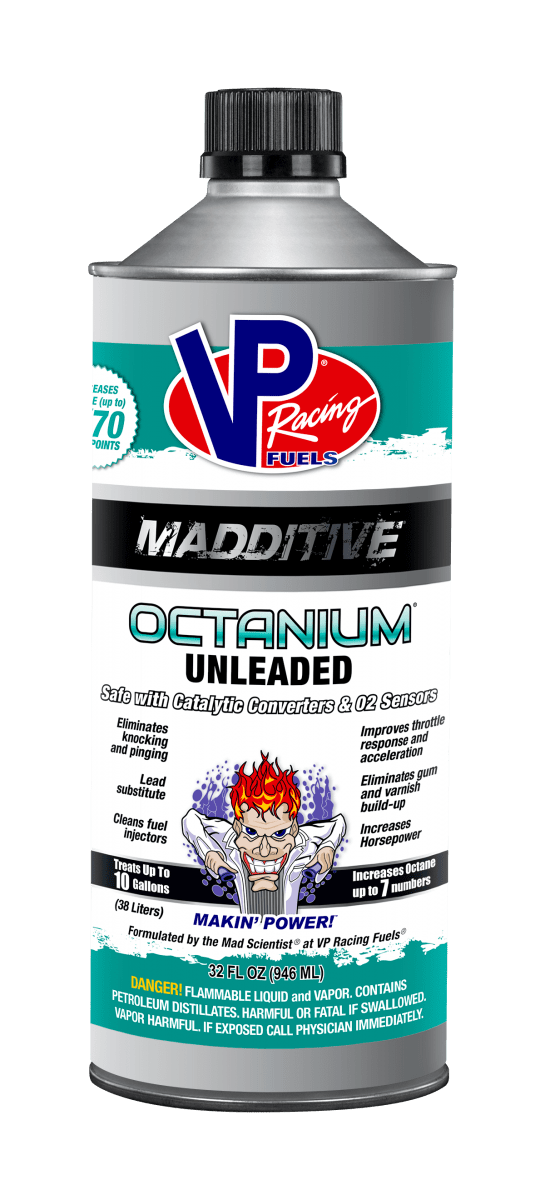Octanium Unleaded är en VP-oktanförstärkare som ökar oktantalet med upp till 70 poäng (7 siffror). Det är säkert att använda med katalysatorer och O2-sensorer. Den rengör bränsleinsprutare, eliminerar knackning och förbättrar gasrespons och acceleration.