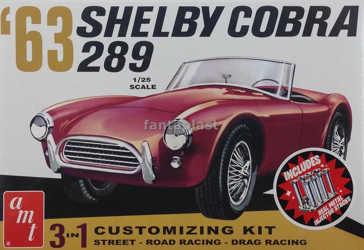 FEATURE PACKED: The 1963 Shelby Cobra 289 Roadster custom kit features eight real metal injector stacks, a 289 cu. Inch engine, fastback top, GT steering wheel, drag grille and drag fuel tank, tonneau cover, pad-printed drag slicks, and more customizing options! This kit also includes a huge 6” x 8” BRAND NEW colorful decal sheet loaded with options and comes in new vintage style AMT packaging.