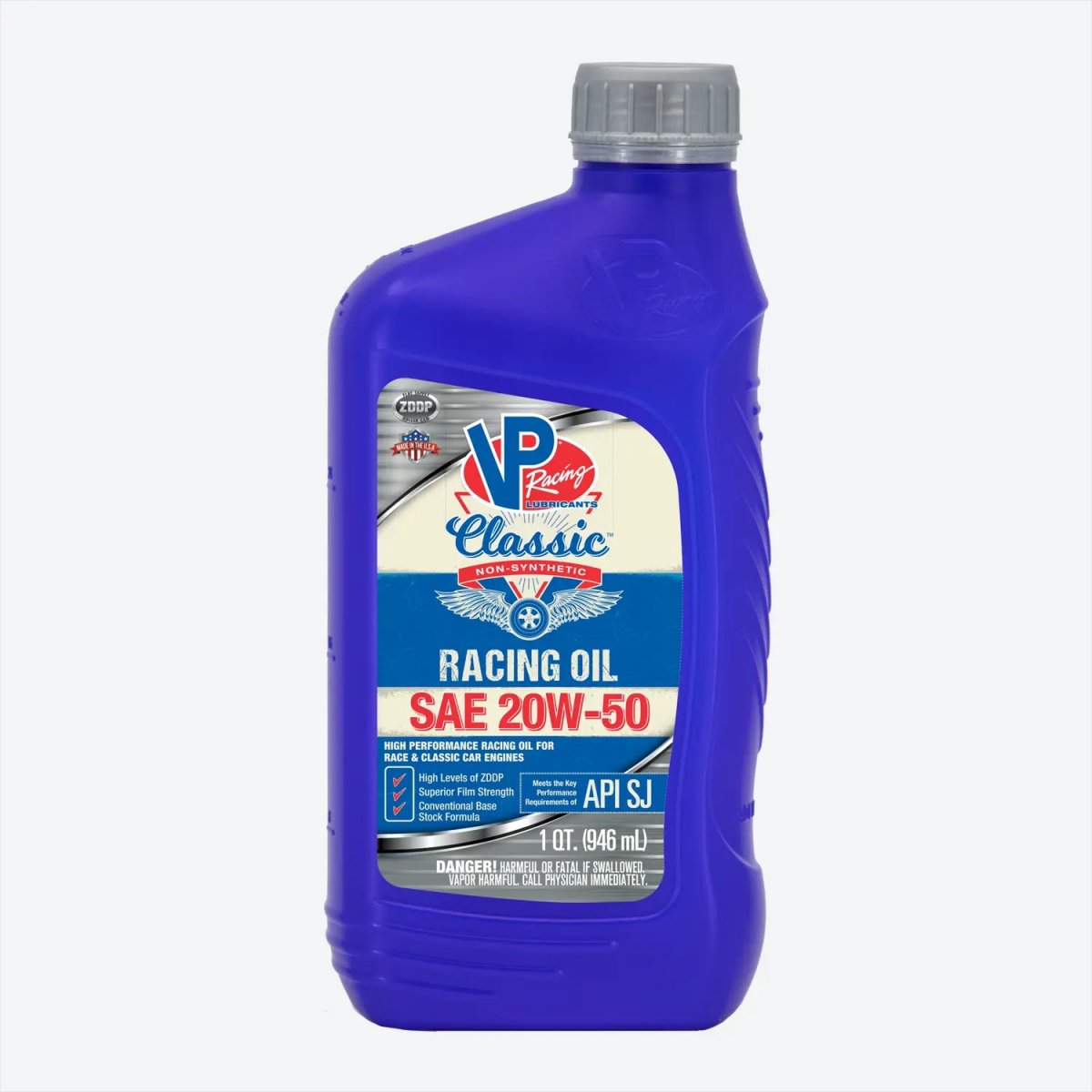 Mineralolja från VP Racing innehållandes extra mycket Zinktillsatser (ZDDP). Lämplig olja till högeffektsmotorer med Flat tappet- eller rullkamaxel där man vill ha en mineralolja med 20W50 viskositet.