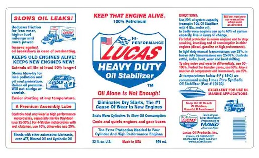 Lucas Oil Heavy Duty oil stabilizer är en tillsatts av petroleum med flera användningsområden. Hjälper mot buller, värme och slitage i manuella växellådor och differentialer. Nummer 1 inom industrin för tunga fordon och högpresterande fordon. Lucas Oil Stabilizer är en 100 % petroleumprodukt formulerad för att eliminera torrstarter och minska friktion, värme och slitage i alla typer av motorer. Den ger motoroljan en högre grad av smörjförmåga vilket minskar oljeförbrukningen och driftstemperaturerna. Använd Lucas Oil Stabilizer i växellådsolja för att stoppa läckor, sänka driftstemperaturer och öka växeloljans livslängd. Eftersom den är ren petroleum kan den säkert blandas med alla andra smörjmedel för bilar, även syntetiska smörjmedel, ATF och mineralolja. Den håller gamla motorer vid liv och nya motorer nya, såväl i diesel- som bensindrivna.
