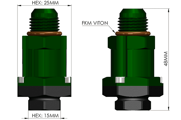 Denna högflödesbackventil passar på utloppet på många bränslepumpar. Backventilen har mycket högre flöde än som är standard på många bränslepumpar. Detta håller bränsletemperaturerna lägre och förhindrar kavitation. De två aluminiumadapterhalvorna är säkrade tillsammans med en hållare i rostfritt stål och bultar som klämmer fast runt pumpens utlopp. En kolv och fjäder av rostfritt stål används för att göra en backventil. O-ringstätning för läckagefri anslutning och E85-kompatibilitet.