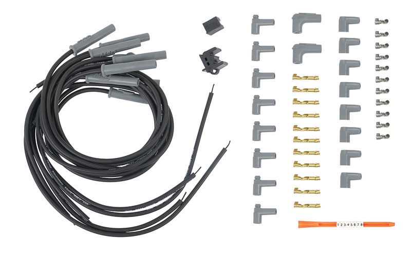 Levereras med 8 tändkablar plus 1 kabel till tändspolen. Satsen inkluderar tändhattar för både HEI och vanlig fördelare samt pressverktyg och märkhylsor.